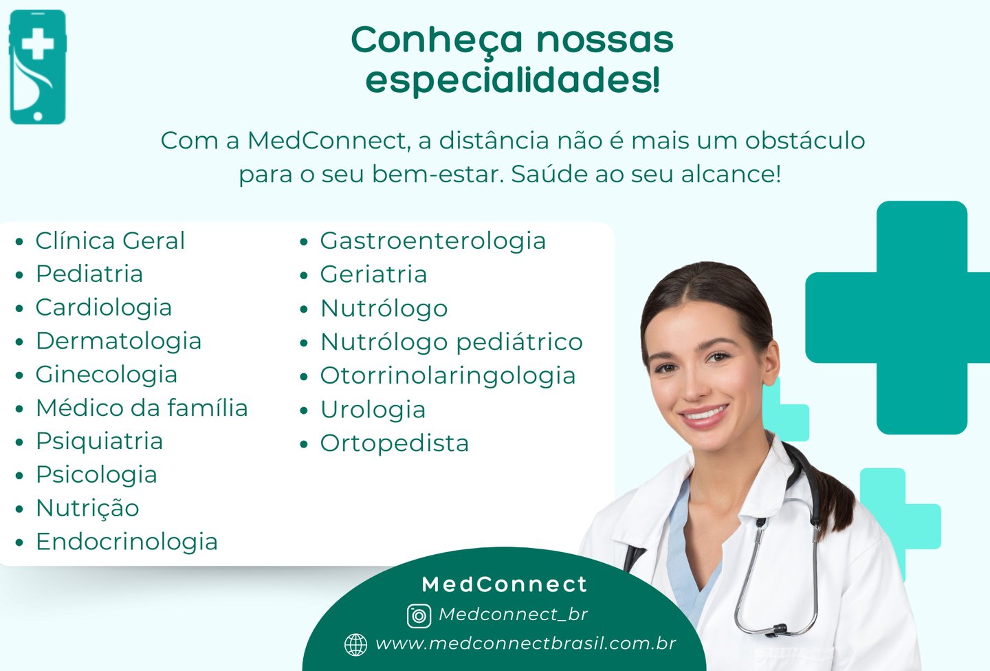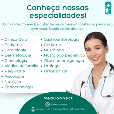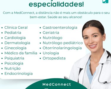 Imagine ter a confiança de saber que, em qualquer momento, qualquer hora, você pode contar com um médico de verdade, pronto para cuidar de você e da sua família, tudo isso sem precisar sair de casa. A MedConnectBrasil é a porta para um novo jeito de viver a saúde: acessível, confiável e feito especialmente para pessoas como você. Aqui, sua saúde tem a atenção que merece, com a facilidade de um clique e o preço que cabe no seu bolso. Somos mais do que um serviço, somos o futuro da saúde no Brasil, ao alcance de todos.